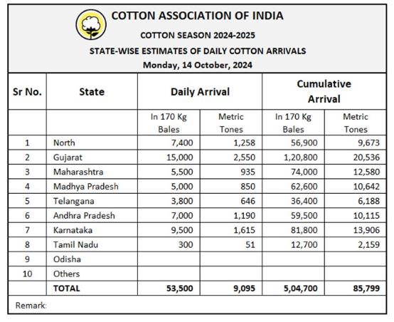 據(jù)外電10月14日消息,印度棉花協(xié)會(huì)(CAI)公布,10月14日印度棉花到貨量預(yù)估為53500包(每包170公斤)或9095噸。