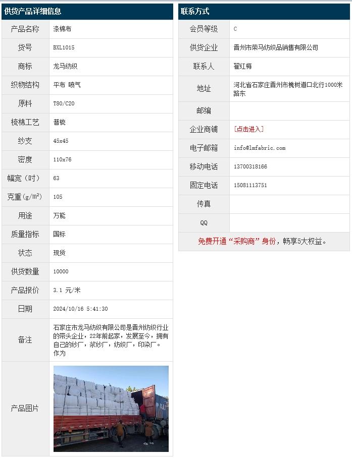 10月15日,晉州榮馬紡織品銷售有限公司滌棉平布T80/C20 45x45 110x76 63" 105g/㎡ 噴氣,報(bào)價(jià)為3.1元/米,實(shí)際成交價(jià)以協(xié)商為準(zhǔn)。[點(diǎn)擊查看詳情]