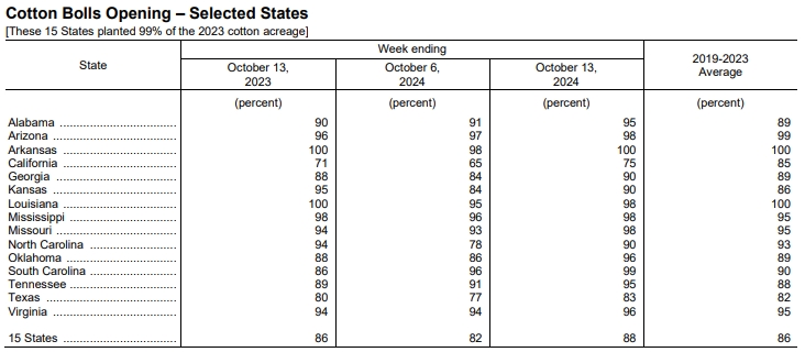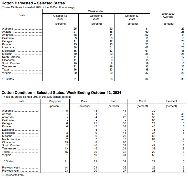 據(jù)外電10月15日消息,美國農(nóng)業(yè)部(USDA)在每周作物生長報告中公布稱,截至2024年10月13日當周,美棉盛鈴率為88%,前周為82%,上年同期為86%,五年均值為86%。美棉收割率為34%,前周為26%,去年同期為31%,五年均值為30%。美棉優(yōu)良率為34%,前周為29%,上年同期為30%。