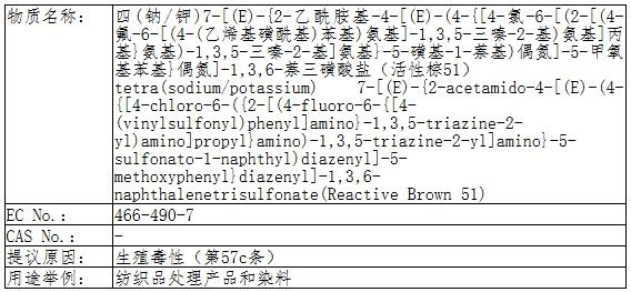 2024年10月10日,歐洲化學(xué)品管理局(ECHA)公布將活性棕51加入SVHC意向物質(zhì)清單。目前處在“提議方準(zhǔn)備相關(guān)物質(zhì)的卷宗”階段,預(yù)計2025年2月3日前提交。后續(xù)ECHA將對意向物質(zhì)發(fā)起公眾咨詢,在公眾咨詢期間所有利益相關(guān)方均可向ECHA提交反饋意見,如反饋意見被評議通過,將被正式加入SVHC候選清單。