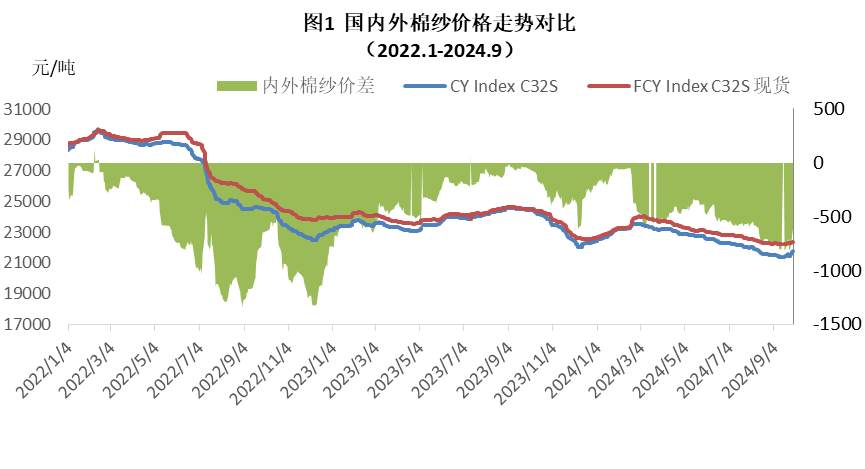 本月內(nèi)外棉紗價(jià)格均下跌,國(guó)產(chǎn)32支純棉紗9月均價(jià)21495元/噸,環(huán)比下跌224元,跌幅1%,同比下跌3029元/噸,跌幅12.35%;進(jìn)口32支純棉紗9月均價(jià)22255元/噸,環(huán)比下跌124元,跌幅0.55%,同比下跌2314元,跌幅9.42%。