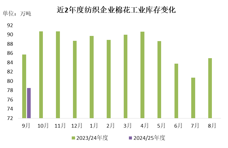 月內(nèi)紗廠訂單有所回暖,但新舊年度交接之際,性?xún)r(jià)比高的合適資源較緊張,企業(yè)僅剛需采購(gòu),等待新棉上市,總體原料庫(kù)存小幅下降。截至9月30日,紡織廠在庫(kù)棉花工業(yè)庫(kù)存量78.5萬(wàn)噸,環(huán)比減少6.4萬(wàn)噸,同比減少7.2萬(wàn)噸。其中:25%企業(yè)增加棉花庫(kù)存,45%減少庫(kù)存,30%基本保持不變。