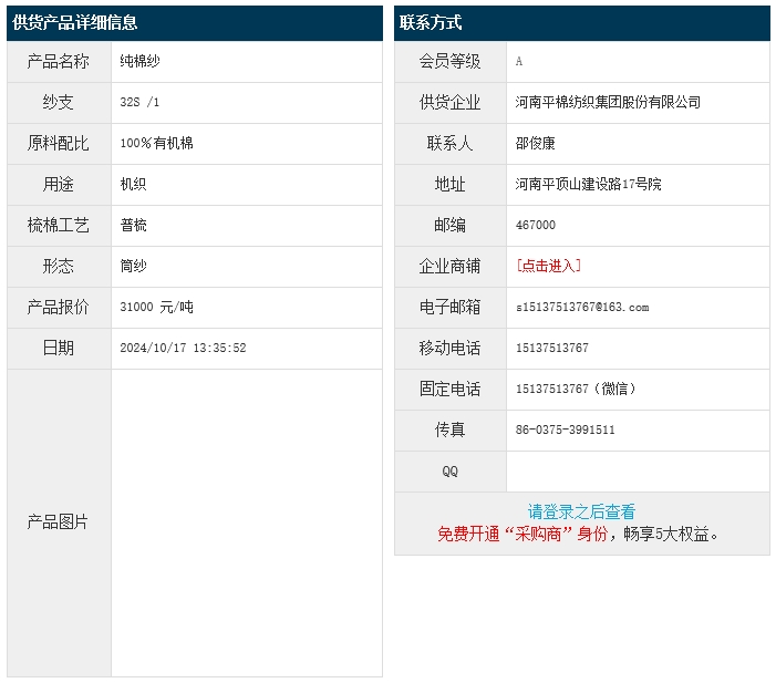 10月17日,河南平棉紡織集團(tuán)股份有限公司機(jī)織用有機(jī)棉100 32S,報(bào)價為31000元/噸,實(shí)際成交價以協(xié)商為準(zhǔn)。[點(diǎn)擊查看詳情]