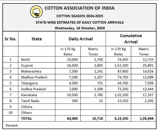 據外電10月16日消息,印度棉花協(xié)會(CAI)公布,10月16日印度棉花到貨量預估為63000包(每包170公斤)或10710噸。