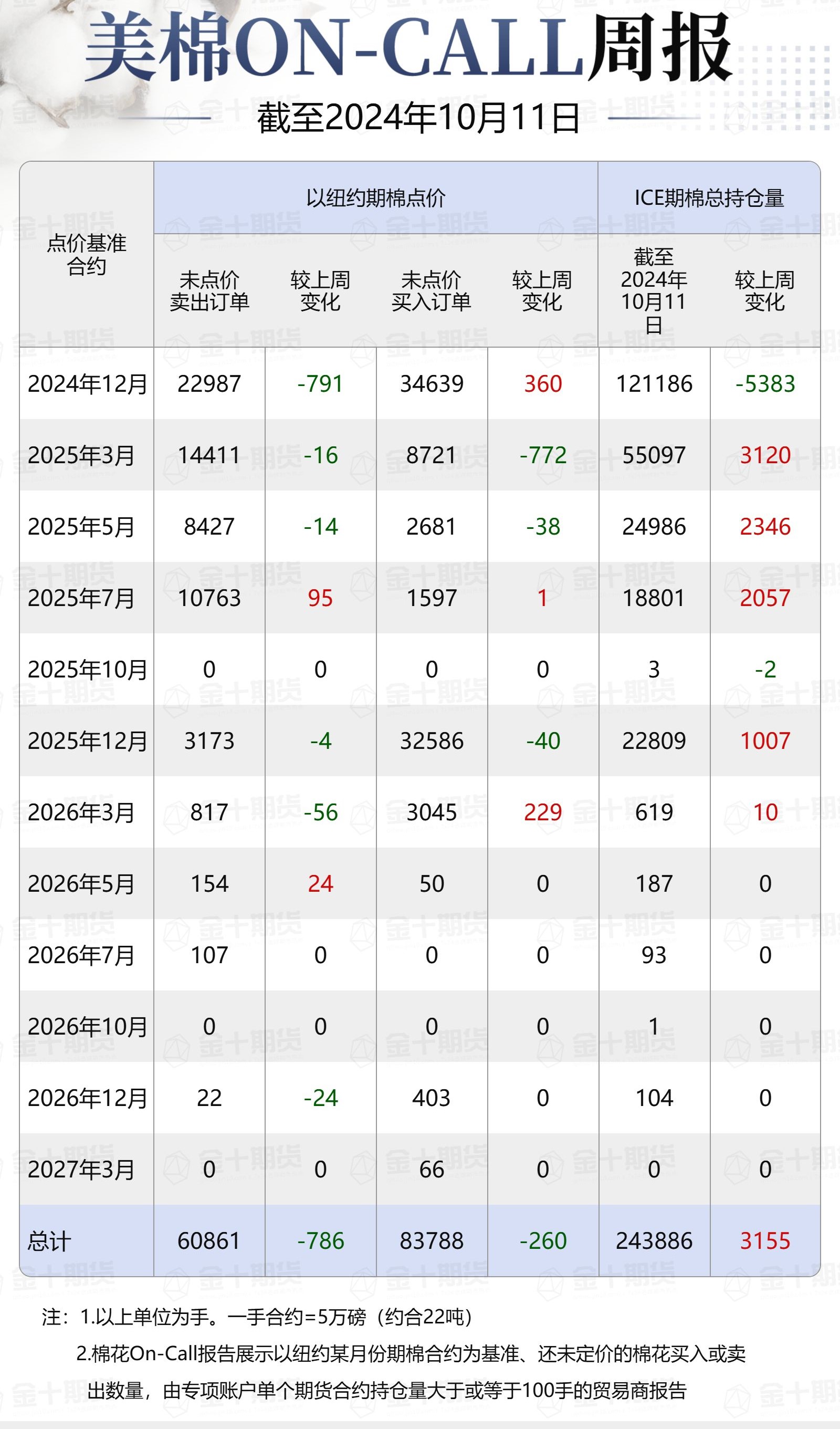 據(jù)美國商品期貨交易委員會(CFTC)最新數(shù)據(jù),截至10月11日,①美棉On-Call未點價賣出訂單60861手,環(huán)比減少786手;未點價買入訂單83788手,環(huán)比減少260手;②ICE期棉2412合約上賣方未點價合約為22987手,環(huán)比減少791手;③ICE期棉2503合約上賣方未點價合約為14411手,環(huán)比減少16手;④ICE期棉2505合約上賣方未點價合約為8427手,環(huán)比減少14手;⑤ICE期棉2507合約上賣方未點價合約為10763手,環(huán)比增加95手;⑥ICE棉花期貨盤面2024/25年度(8月至次年7月)的On-Call合約未點價賣出訂單為56588手,環(huán)比減少726手。