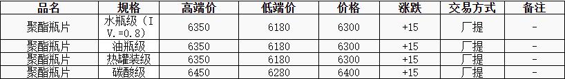 華東聚酯瓶片價格上漲15元至6300元/噸,原料震蕩,拖累聚酯瓶片工廠報價多下調(diào)50元/噸。然部分貨源提貨緊張,聚酯瓶片價格較原料抗跌。持貨商報盤6180-6350,場內(nèi)觀望情緒濃厚。
