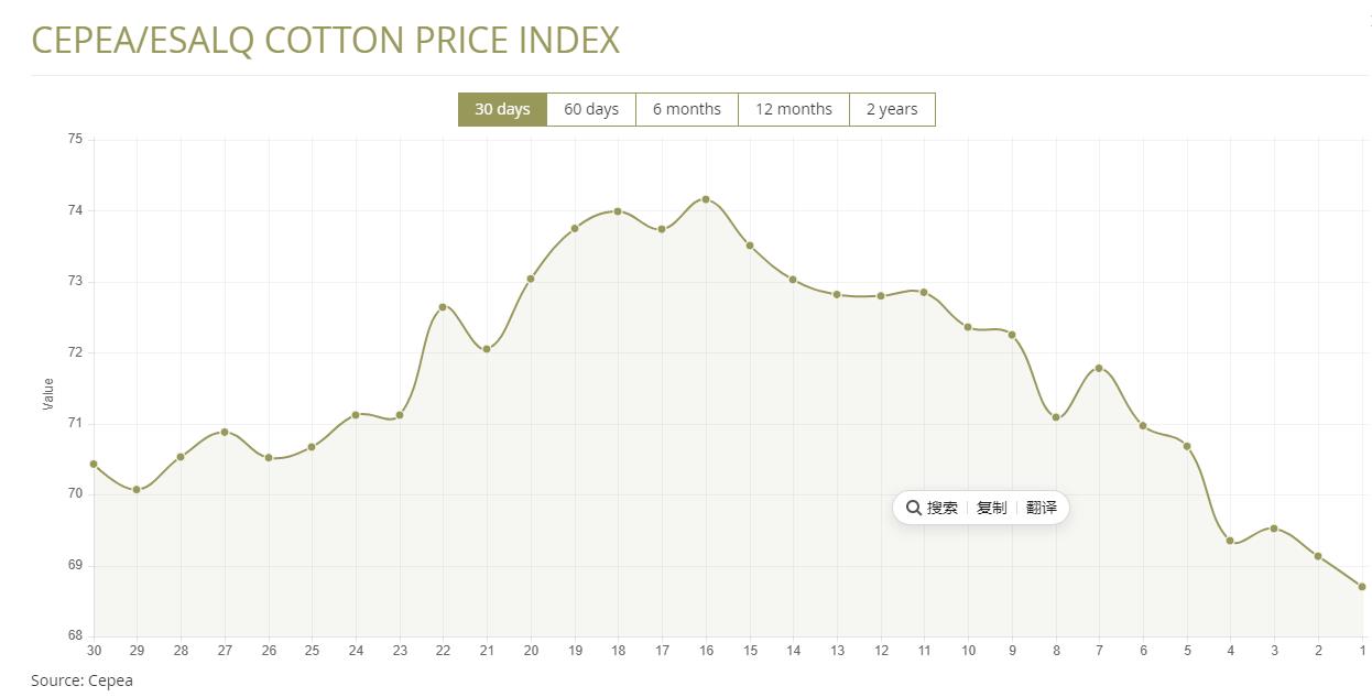 據(jù)外電10月18日消息,10月18日巴西CEPEA/ESALQ棉花價格指數(shù)報每磅68.70美分,較前一日下跌0.62%。