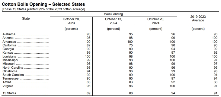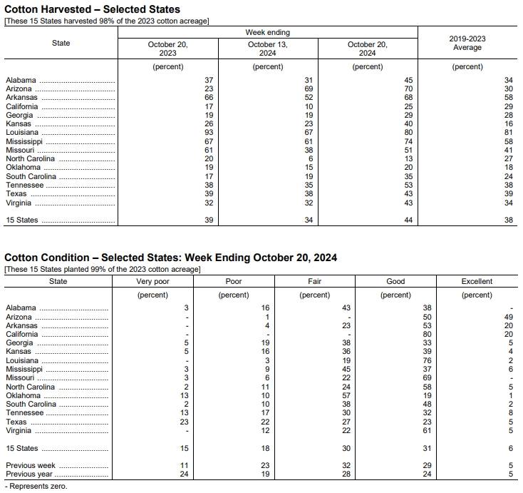 據(jù)外電10月22日消息,美國(guó)農(nóng)業(yè)部(USDA)在每周作物生長(zhǎng)報(bào)告中公布稱,截至10月20日當(dāng)周,美棉盛鈴率為94%,前周為88%,上年同期為89%,五年均值為91%。美棉收割率為44%,前周為34%,去年同期為39%,五年均值為38%。美棉優(yōu)良率為37%,前周為34%,上年同期為29%。