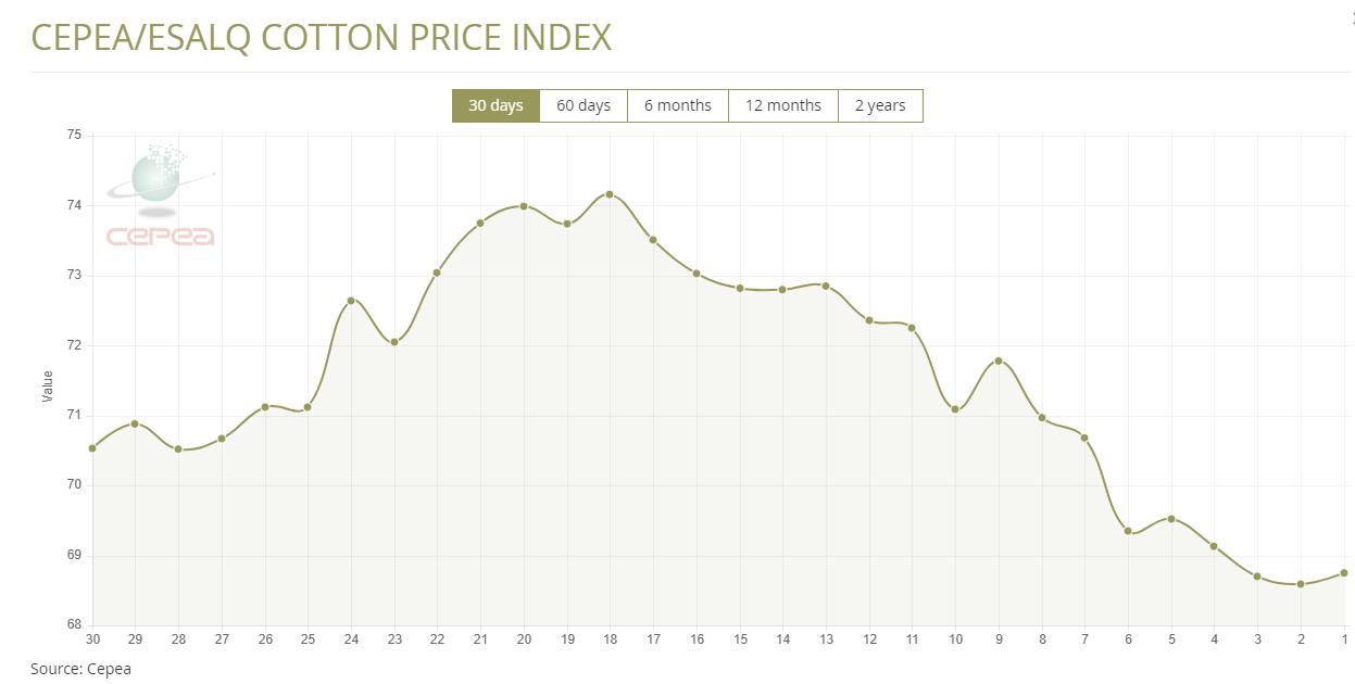據(jù)外電10月22日消息,10月22日巴西CEPEA/ESALQ棉花價(jià)格指數(shù)報(bào)每磅68.75美分,較前一日上漲0.23%。