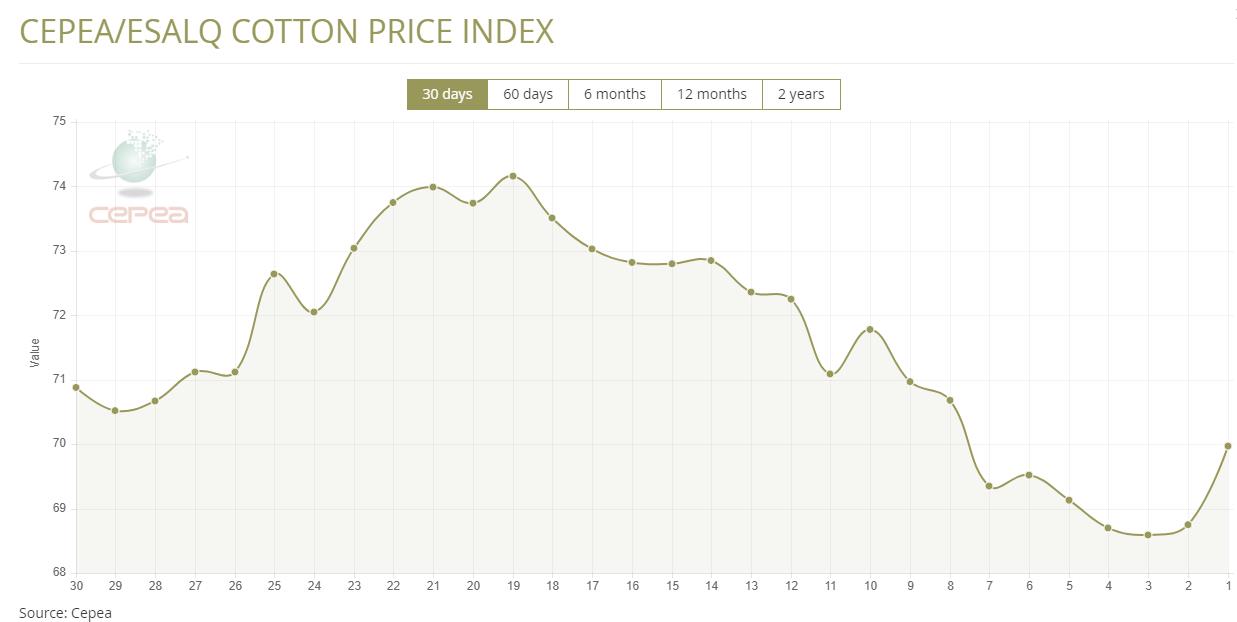 據(jù)外電10月23日消息,10月23日巴西CEPEA/ESALQ棉花價格指數(shù)報每磅69.97美分,較前一日上漲1.77%。
