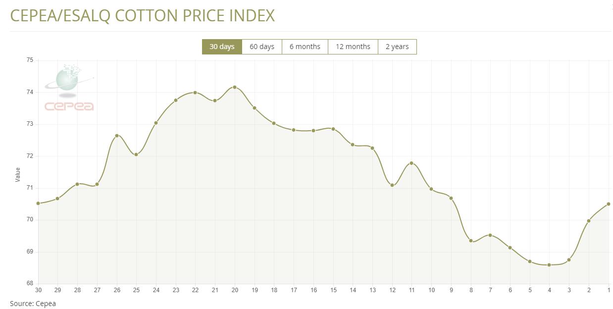 據(jù)外電10月24日消息,10月24日巴西CEPEA/ESALQ棉花價格指數(shù)報每磅70.50美分,較前一日上漲0.76%。