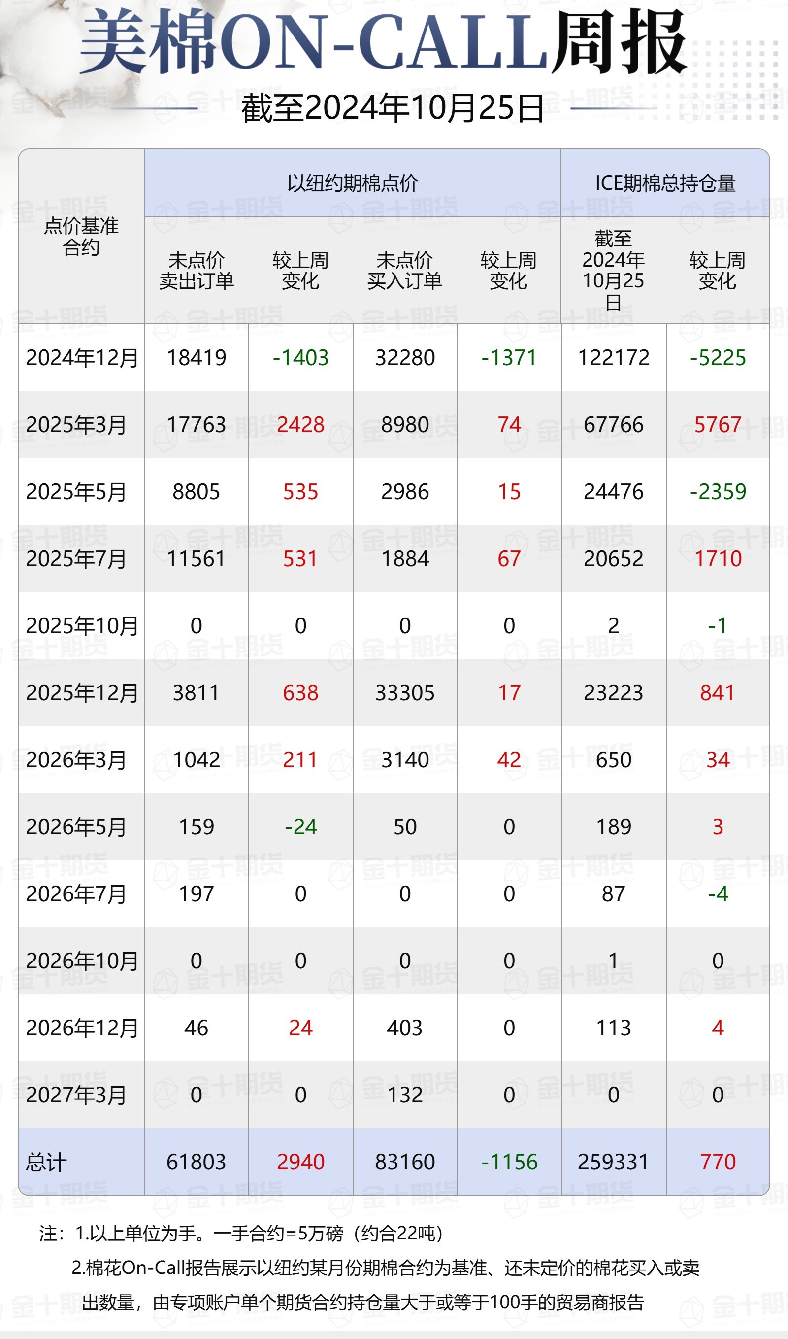 據(jù)美國商品期貨交易委員會(huì)(CFTC)最新數(shù)據(jù),截至10月25日,①美棉On-Call未點(diǎn)價(jià)賣出訂單61803手,環(huán)比增加2940手;未點(diǎn)價(jià)買入訂單83160手,環(huán)比減少1156手;②ICE期棉2412合約上賣方未點(diǎn)價(jià)合約為18419手,環(huán)比減少1403手;③ICE期棉2503合約上賣方未點(diǎn)價(jià)合約為17763手,環(huán)比增加2428手;④ICE期棉2505合約上賣方未點(diǎn)價(jià)合約為8805手,環(huán)比增加535手;⑤ICE期棉2507合約上賣方未點(diǎn)價(jià)合約為11561手,環(huán)比增加531手;⑥ICE棉花期貨盤面2024/25年度(8月至次年7月)的On-Call合約未點(diǎn)價(jià)賣出訂單為56548手,環(huán)比增加2091手。