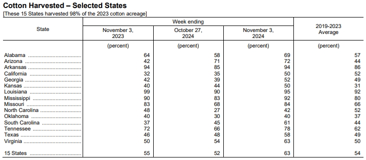 據(jù)外電11月4日消息,美國農(nóng)業(yè)部(USDA)在每周作物生長報(bào)告中公布稱,截至11月3日當(dāng)周,美棉收割率為63%,前周為52%,去年同期為55%,五年均值為54%。