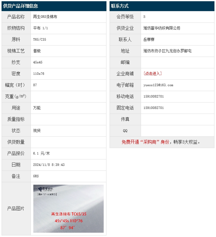 11月8日,濰坊富華紡織有限公司再生GRS滌棉平布T65/C35 45x45 110x76 87" 1/1,報價為6.1元/米,實際成交價以協(xié)商為準。[點擊查看詳情]