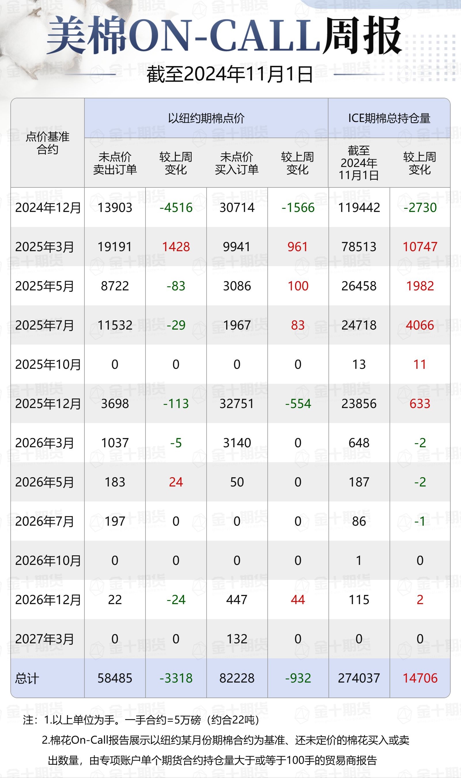 據(jù)美國(guó)商品期貨交易委員會(huì)(CFTC)最新數(shù)據(jù),截至11月1日,①美棉On-Call未點(diǎn)價(jià)賣(mài)出訂單58485手,環(huán)比減少3318手;未點(diǎn)價(jià)買(mǎi)入訂單82228手,環(huán)比減少932手;②ICE期棉2412合約上賣(mài)方未點(diǎn)價(jià)合約為13903手,環(huán)比減少4516手;③ICE期棉2503合約上賣(mài)方未點(diǎn)價(jià)合約為19191手,環(huán)比增加1428手;④ICE期棉2505合約上賣(mài)方未點(diǎn)價(jià)合約為8722手,環(huán)比減少83手;⑤ICE期棉2507合約上賣(mài)方未點(diǎn)價(jià)合約為11532手,環(huán)比減少29手;⑥ICE棉花期貨盤(pán)面2024/25年度(8月至次年7月)的On-Call合約未點(diǎn)價(jià)賣(mài)出訂單為53348手,環(huán)比減少3200手。