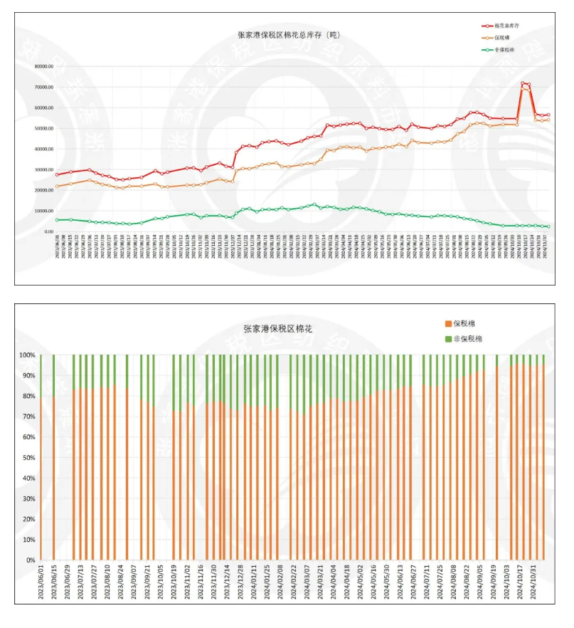據(jù)張家港保稅區(qū)紡織原料市場(chǎng)統(tǒng)計(jì),截至2024年11月11日,張家港保稅區(qū)棉花總庫(kù)存5.65萬(wàn)噸,較上月同比增長(zhǎng)0.60%;其中保稅棉5.41萬(wàn)噸,較上月同比增長(zhǎng)0.95%;非保稅棉0.24萬(wàn)噸,較上月同比減少6.47%。從進(jìn)口棉來(lái)源地來(lái)看,張家港保稅區(qū)棉花庫(kù)存中:美棉占比46.51%,較上月同比減少1.01百分點(diǎn);巴西棉占比17.47%,較上月同比減少0.25百分點(diǎn);其他國(guó)家及地區(qū)占比35.5%,較上月同比增長(zhǎng)1.22百分點(diǎn)。當(dāng)周進(jìn)口棉進(jìn)出入庫(kù)動(dòng)態(tài)變化情況,張家港保稅區(qū)棉花庫(kù)存中,出庫(kù)1761.22噸,入庫(kù)1903.08噸,凈入庫(kù)(141.86)噸。