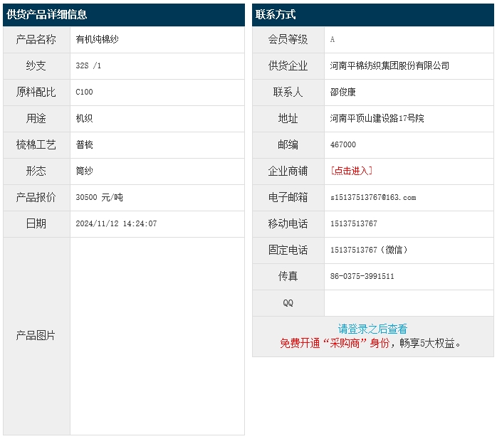 11月12日,河南平棉紡織集團股份有限公司機織用有機純棉紗C100 32S,報價為30500元/噸,實際成交價以協(xié)商為準。[點擊查看詳情]