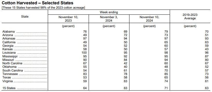 據(jù)外電11月12日消息,美國(guó)農(nóng)業(yè)部(USDA)在每周作物生長(zhǎng)報(bào)告中公布稱(chēng),截至2024年11月10日當(dāng)周,美棉收割率為71%,前周為63%,去年同期為64%,五年均值為63%。