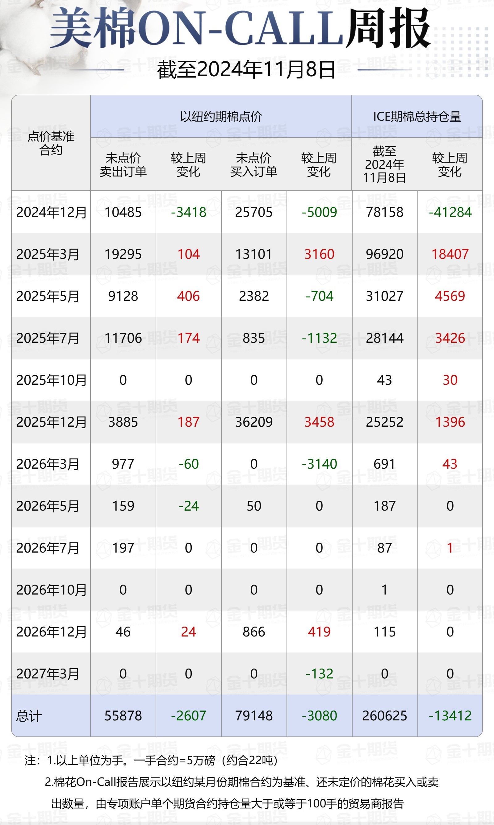 據(jù)美國商品期貨交易委員會(huì)(CFTC)最新數(shù)據(jù),截至11月8日,①美棉On-Call未點(diǎn)價(jià)賣出訂單55878手,環(huán)比減少2607手;未點(diǎn)價(jià)買入訂單79148手,環(huán)比減少3080手;②ICE期棉2412合約上賣方未點(diǎn)價(jià)合約為10485手,環(huán)比減少3418手;③ICE期棉2503合約上賣方未點(diǎn)價(jià)合約為19295手,環(huán)比增加104手;④ICE期棉2505合約上賣方未點(diǎn)價(jià)合約為9128手,環(huán)比增加406手;⑤ICE期棉2507合約上賣方未點(diǎn)價(jià)合約為11706手,環(huán)比增加174手;⑥ICE棉花期貨盤面2024/25年度(8月至次年7月)的On-Call合約未點(diǎn)價(jià)賣出訂單為50614手,環(huán)比減少2734手。