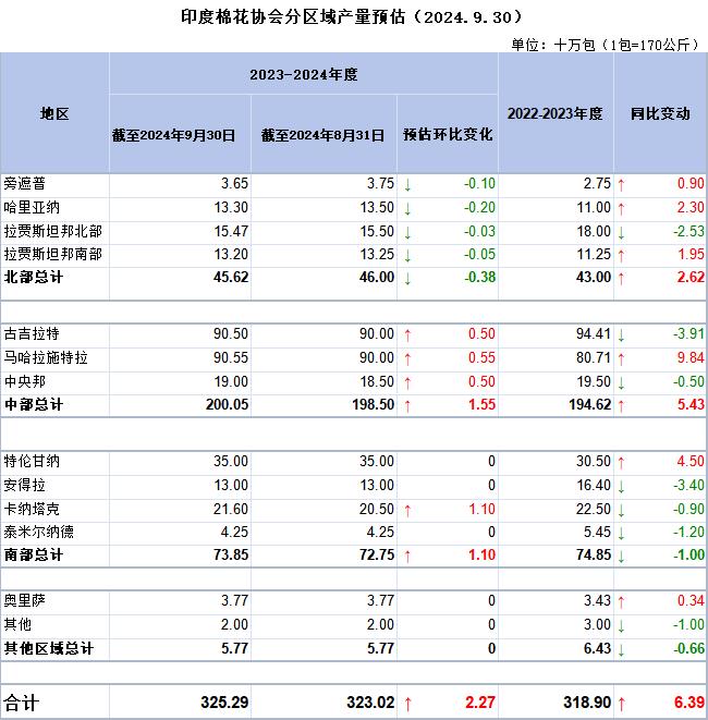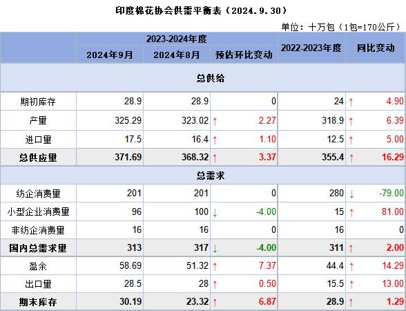 印度棉花協(xié)會(huì)(CAI)將2023/24年度印度棉花產(chǎn)量預(yù)估從3230.2萬包上調(diào)至3252.9萬包,上調(diào)幅度為22.7萬包,同時(shí)也高于2022/23年度的3189萬包;國內(nèi)總需求預(yù)估從3170萬包下調(diào)至3130萬包;期末庫存預(yù)估從233.2萬包上調(diào)至301.9萬包;出口量預(yù)估從280萬包上調(diào)至285萬包。