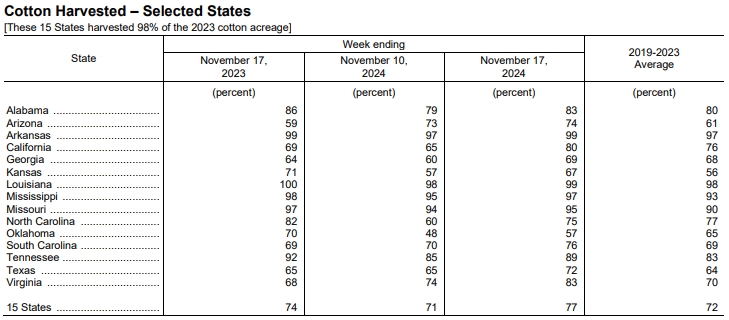 美棉收割繼續(xù)推進(jìn),熱帶風(fēng)暴給得州到東南地區(qū)帶來強(qiáng)降雨,造成田間采摘短時(shí)暫停,收割進(jìn)度有所放緩,但仍快于正常水平,阿肯色州、路易斯安那州、密西西比州、密蘇里州的收割已基本結(jié)束,持續(xù)關(guān)注主產(chǎn)區(qū)天氣對(duì)收割的影響。據(jù)外電11月18日消息,美國農(nóng)業(yè)部(USDA)在每周作物生長報(bào)告中公布稱,截至2024年11月17日當(dāng)周,美國棉花收割率為77%,前周為71%,去年同期為74%,五年均值為72%。