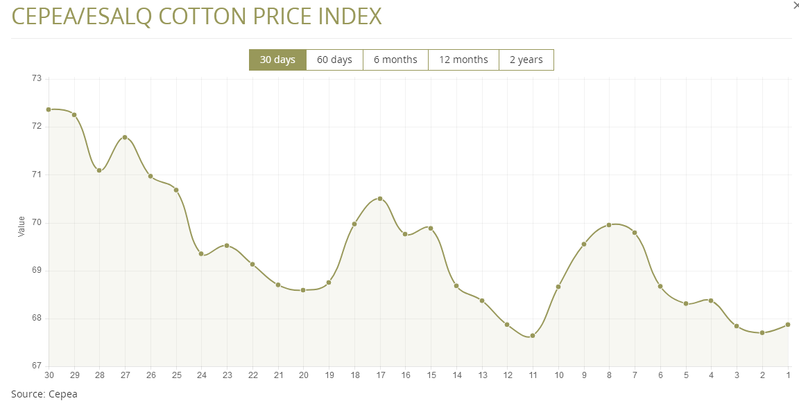 據(jù)外電11月18日消息,11月18日巴西CEPEA/ESALQ棉花價(jià)格指數(shù)報(bào)67.87美分/磅,較前一日上漲0.25%。