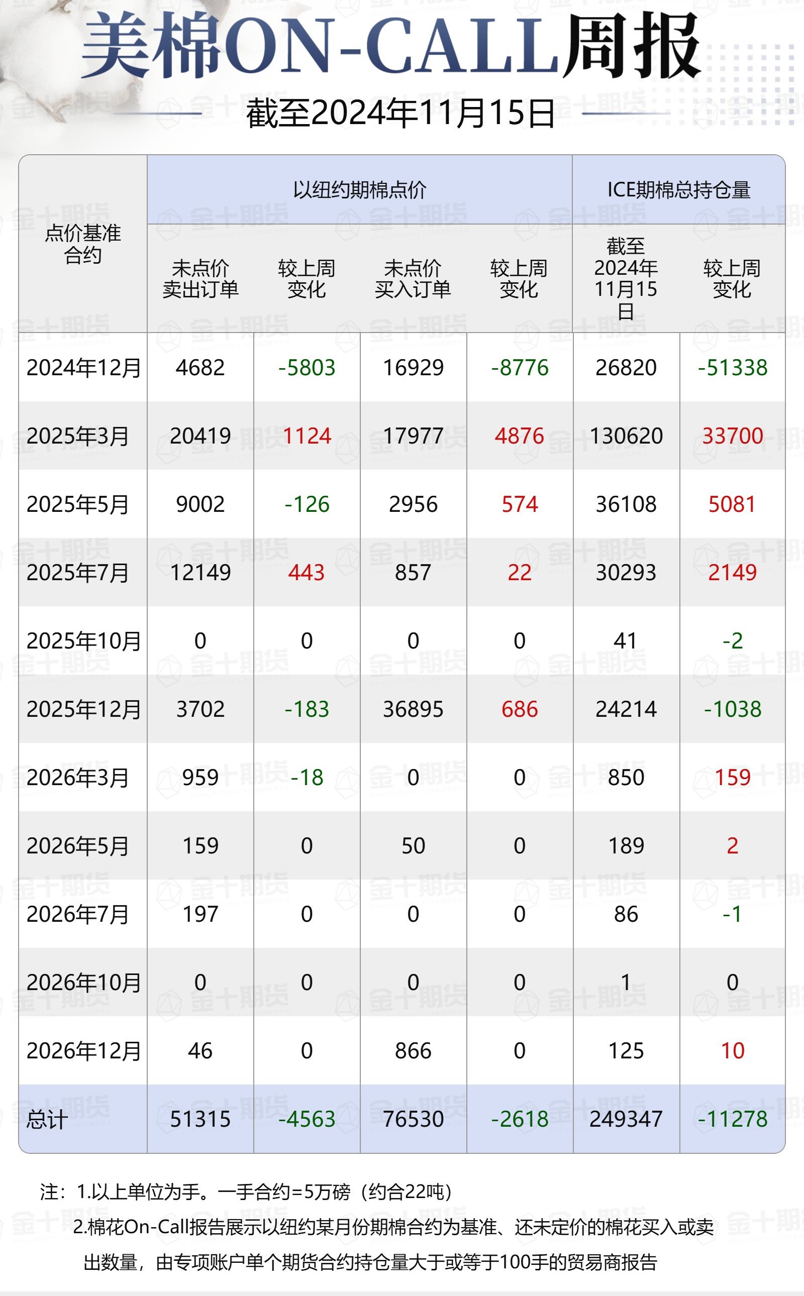 據(jù)美國(guó)商品期貨交易委員會(huì)(CFTC)最新數(shù)據(jù),截至11月15日,①美棉On-Call未點(diǎn)價(jià)賣出訂單51315手,環(huán)比減少4563手;未點(diǎn)價(jià)買入訂單76530手,環(huán)比減少2618手;②ICE期棉2412合約上賣方未點(diǎn)價(jià)合約為4682手,較此前一周減少5803手;③ICE期棉2503合約上賣方未點(diǎn)價(jià)合約為20419手,較此前一周增加1124手;④ICE期棉2505合約上賣方未點(diǎn)價(jià)合約為9002手,較此前一周減少126手;⑤ICE期棉2507合約上賣方未點(diǎn)價(jià)合約為12149手,較此前一周增加443手;⑥ICE棉花期貨盤面2024/25年度(8月至次年7月)的On-Call合約未點(diǎn)價(jià)賣出訂單為46252手,環(huán)比減少4362手。