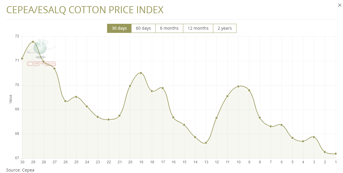 據(jù)外電11月21日消息,11月21日巴西CEPEA/ESALQ棉花價格指數(shù)報67.19美分/磅,較前一日下跌0.10%。