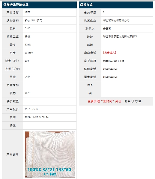 11月23日,濰坊富華紡織有限公司純棉斜紋C100 32x21 133x60 105" 3/1 噴氣,報(bào)價(jià)為11.8元/米,實(shí)際成交價(jià)以協(xié)商為準(zhǔn)。[點(diǎn)擊查看詳情]