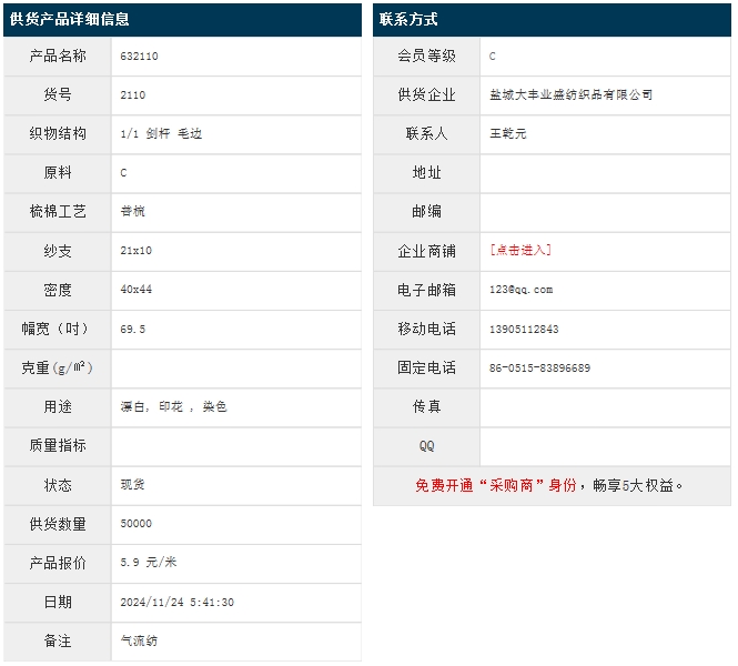 11月23日,鹽城大豐業(yè)盛紡織品有限公司純棉布OEC100 21x10 40x44 69.5" 1/1 劍桿 毛邊,報(bào)價(jià)為5.9元/米,實(shí)際成交價(jià)以協(xié)商為準(zhǔn)。[點(diǎn)擊查看詳情]