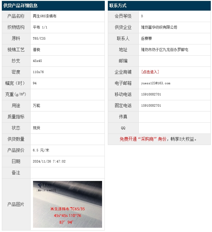 11月26日,濰坊富華紡織有限公司再生GRS滌棉平布T65/C35 45x45 110x76 94" 1/1,報價為6.5元/米,實際成交價以協(xié)商為準。[點擊查看詳情]