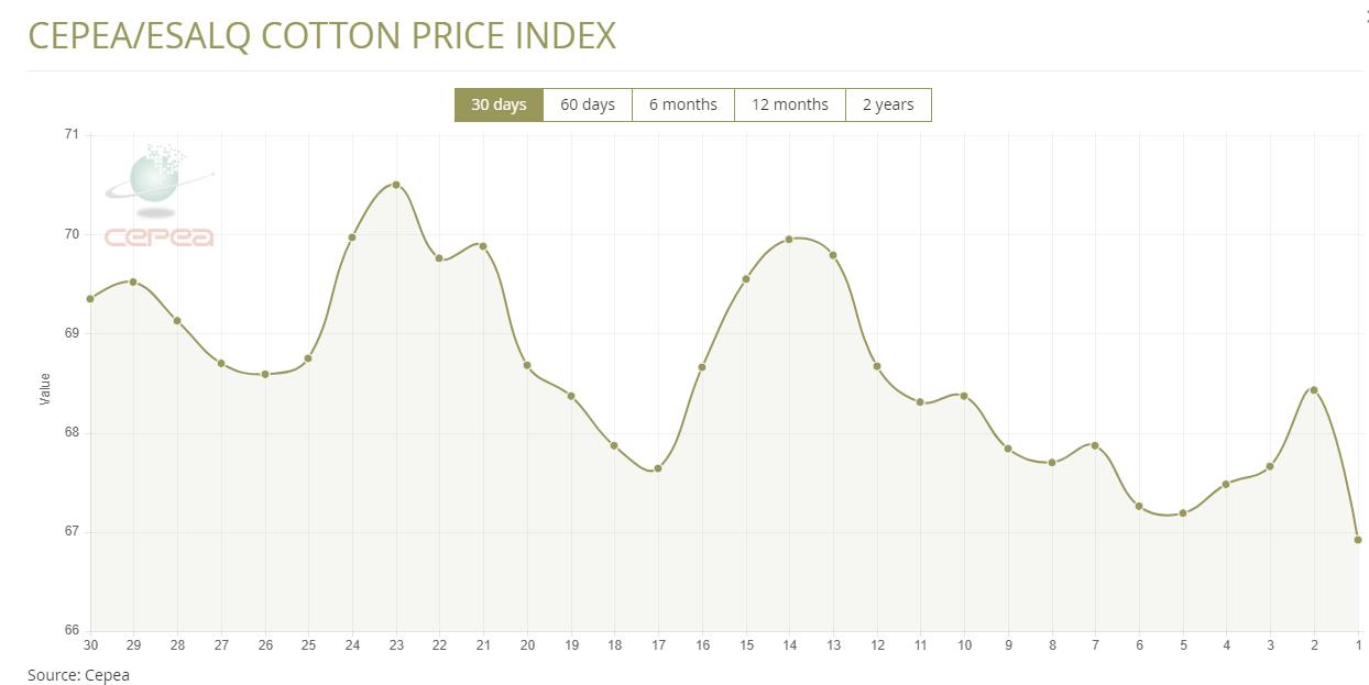 據(jù)外電11月27日消息,11月27日巴西CEPEA/ESALQ棉花價(jià)格指數(shù)報(bào)66.92美分/磅,較前一日下跌2.21%。