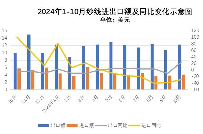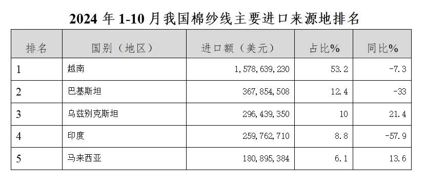 從大類產(chǎn)品看,2024年1-10月進口棉紗線29.7億美元,同比下降17.7%,進口數(shù)量124.4萬噸,同比下降9.8%;進口化纖11.9億美元,同比上漲3.4%;進口絲線和羊毛、動物紗線分別292.9萬美元、1.1億美元,同比增長47%、14.4%。我國紗線進口以棉紗線為主,占紗線進口總額的70%。
