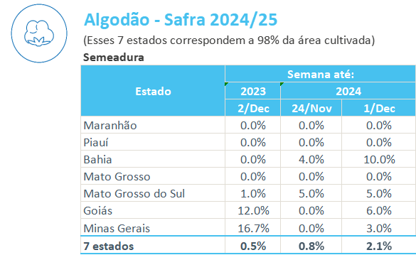 據(jù)巴西農(nóng)業(yè)部下屬的國家商品供應(yīng)公司CONAB,截至12月1日,巴西棉花播種率為2.1%,上周為0.8%,去年同期為0.5%。