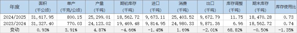 2024/25年度全球棉花期末庫存預估為1847.03萬噸(上月預估為1846.10萬噸),同比減少0.5%,2023/24年度期末庫存預估為1856.27萬噸。
