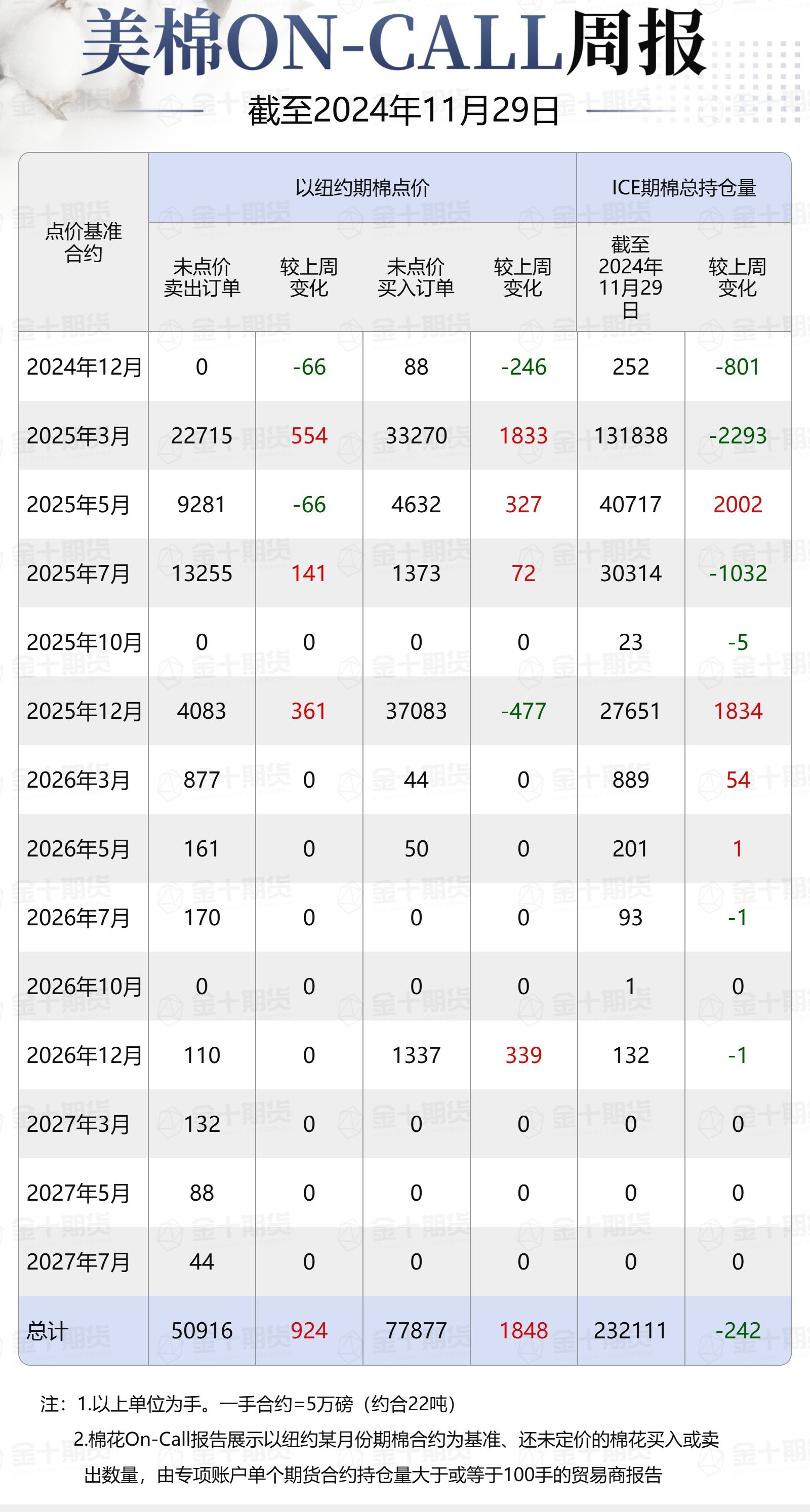 據(jù)美國(guó)商品期貨交易委員會(huì)(CFTC)最新數(shù)據(jù),截至11月29日,①美棉On-Call未點(diǎn)價(jià)賣出訂單50916手,環(huán)比增加924手;未點(diǎn)價(jià)買入訂單77877手,環(huán)比增加1848手;②ICE期棉2412合約上賣方未點(diǎn)價(jià)合約為0手,環(huán)比減少66手;③ICE期棉2503合約上賣方未點(diǎn)價(jià)合約為22715手,環(huán)比增加554手;④ICE期棉2505合約上賣方未點(diǎn)價(jià)合約為9281手,環(huán)比減少66手;⑤ICE期棉2507合約上賣方未點(diǎn)價(jià)合約為13255手,環(huán)比增加141手;⑥ICE棉花期貨盤面2024/25年度(8月至次年7月)的On-Call合約未點(diǎn)價(jià)賣出訂單為45251手,環(huán)比增加563手。
