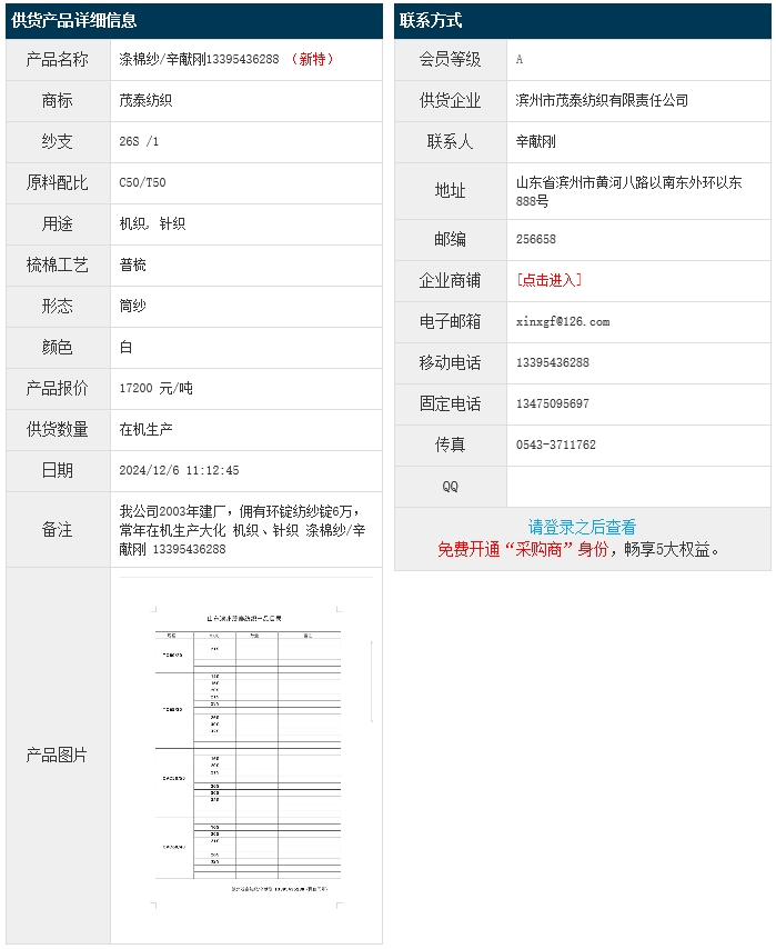 12月6日,濱州茂泰紡織有限責(zé)任公司滌棉紗C50/T50 26S,報(bào)價(jià)為17200元/噸,實(shí)際成交價(jià)以協(xié)商為準(zhǔn)。[點(diǎn)擊查看詳情]