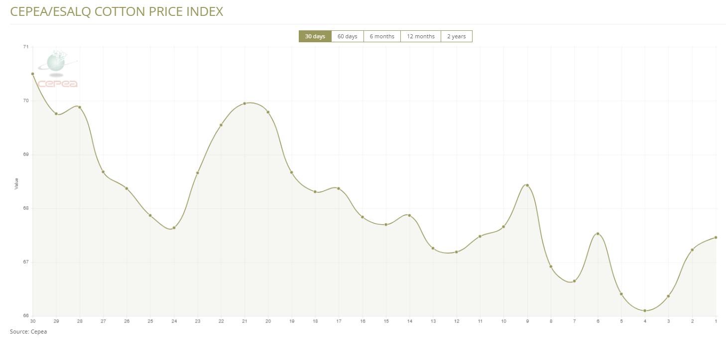 據(jù)外電12月6日消息,12月6日巴西CEPEA/ESALQ棉花價(jià)格指數(shù)報(bào)67.46美分/磅,較前一日上漲0.34%。