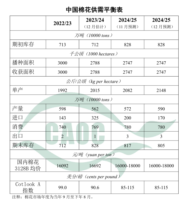 2024/25年度棉花采摘基本結(jié)束,加工和銷售進(jìn)度較快。據(jù)國(guó)家棉花市場(chǎng)監(jiān)測(cè)系統(tǒng)數(shù)據(jù),截至12月5日,全國(guó)新棉加工率和銷售率分別為75.7%和15.4%,同比提高1.9個(gè)和6.2個(gè)百分點(diǎn)。棉花生長(zhǎng)期間,氣候條件總體適宜,病蟲害輕度發(fā)生,實(shí)際單產(chǎn)高于預(yù)期。本月將棉花產(chǎn)量上調(diào)18萬噸至590萬噸。產(chǎn)需缺口持續(xù)縮小,進(jìn)口下調(diào)30萬噸至170萬噸。期末庫(kù)存調(diào)減12萬噸至805萬噸。