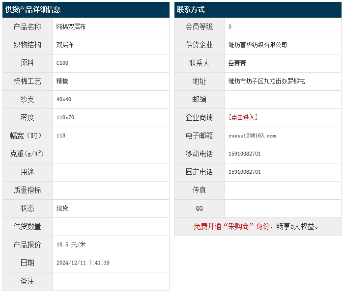 12月11日,濰坊富華紡織有限公司純棉雙層布JC100 40x40 110x70 118",報價為10.5元/米,實際成交價以協(xié)商為準(zhǔn)。[點擊查看詳情]