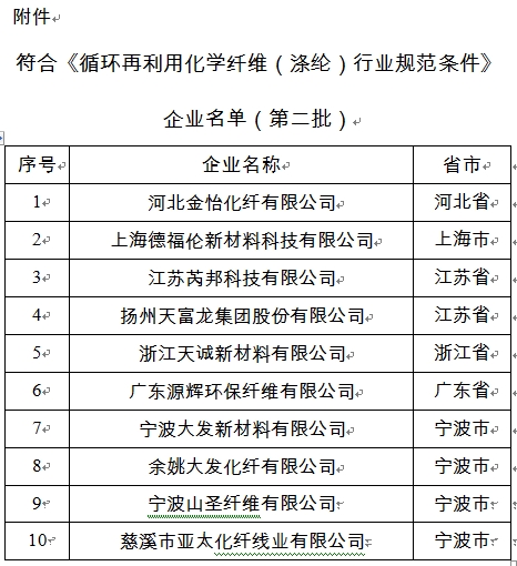 根據(jù)《循環(huán)再利用化學纖維(滌綸)企業(yè)規(guī)范公告管理暫行辦法》有關規(guī)定,經(jīng)企業(yè)自主申報、省級工業(yè)和信息化主管部門核實推薦、專家組評審及征求生態(tài)環(huán)境部意見、對外公示等程序,現(xiàn)將符合《循環(huán)再利用化學纖維(滌綸)行業(yè)規(guī)范條件》企業(yè)名單(第二批)予以公告。