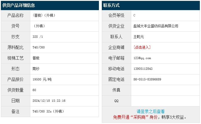 12月18日,鹽城大豐業(yè)盛紡織品有限公司外棉滌棉紗CVC60/40 32S,報價為19500元/噸,實際成交價以協(xié)商為準。[點擊查看詳情]
