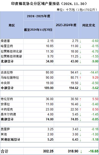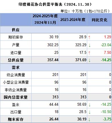 據(jù)外電12月18日消息,印度棉花協(xié)會(CAI)發(fā)布2024/25年度印度棉花供需首份預(yù)估,產(chǎn)量預(yù)估為3022.5萬包,出口預(yù)估為180萬包。期末庫存預(yù)估為264.4萬包,較上年度下滑37.5萬包。
