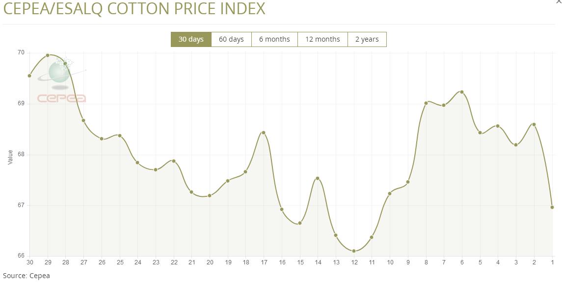 據(jù)外電12月18日消息,12月18日巴西CEPEA/ESALQ棉花價(jià)格指數(shù)報(bào)66.96美分/磅,較前一日下跌2.38%。