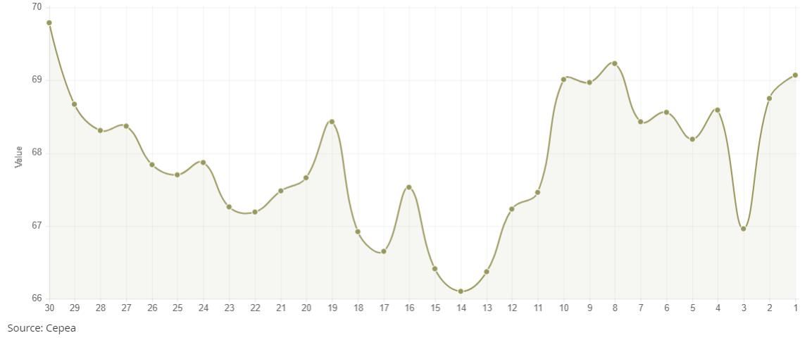 據(jù)外電12月20日消息,12月20日巴西CEPEA/ESALQ棉花價格指數(shù)報69.07美分/磅,較前一日上漲0.47%。