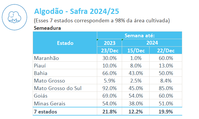 據(jù)巴西農(nóng)業(yè)部下屬的國家商品供應(yīng)公司CONAB,截至12月22日,巴西棉花播種率為19.92%,上周為12.2%,去年同期為21.8%。