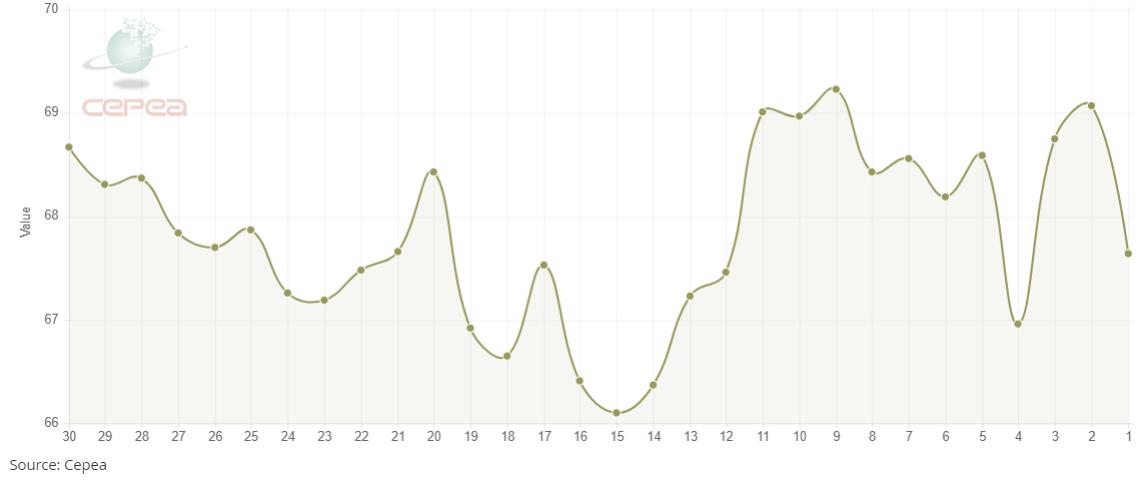 據(jù)外電12月23日消息,12月23日巴西CEPEA/ESALQ棉花價(jià)格指數(shù)報(bào)67.64美分/磅,較前一日下跌2.07%。