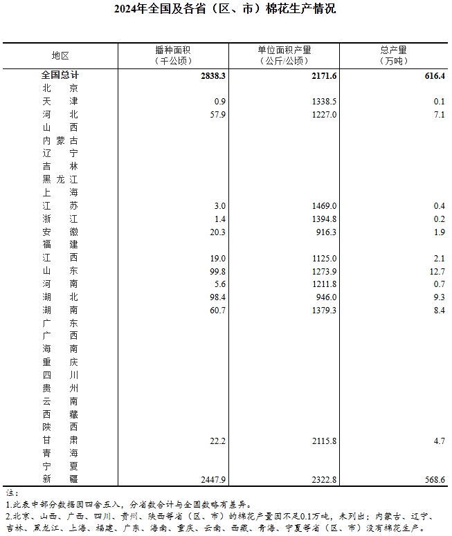 根據(jù)對全國31個省(區(qū)、市)的統(tǒng)計調(diào)查(新疆棉花播種面積通過遙感測量取得),2024年全國棉花播種面積、單位面積產(chǎn)量和總產(chǎn)量分別如下: