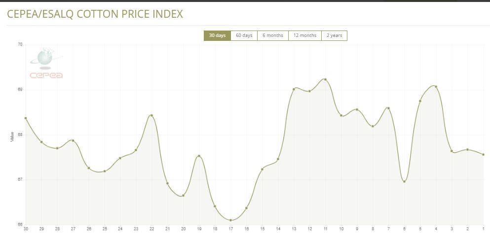 據(jù)外電12月27日消息,12月27日巴西CEPEA/ESALQ棉花價格指數(shù)報67.56美分/磅,較前一交易日下跌0.16%。