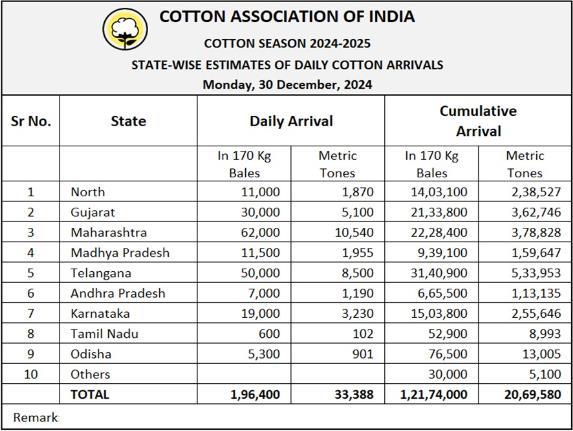 據(jù)外電12月30日消息,印度棉花協(xié)會(CAI)公布,2024年12月30日印度棉花到貨量預估為196400包(每包170公斤)或33388噸。